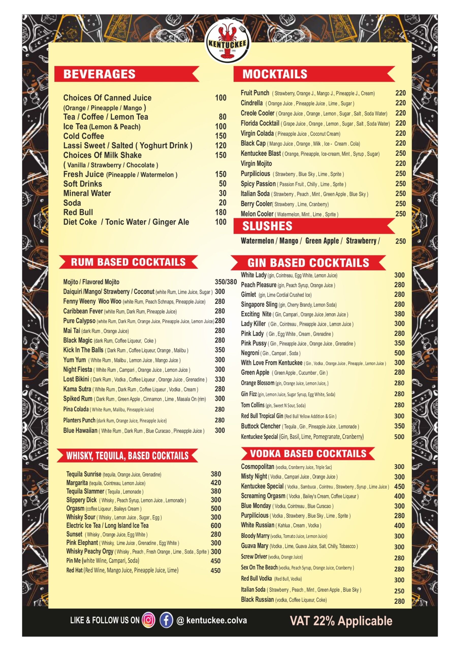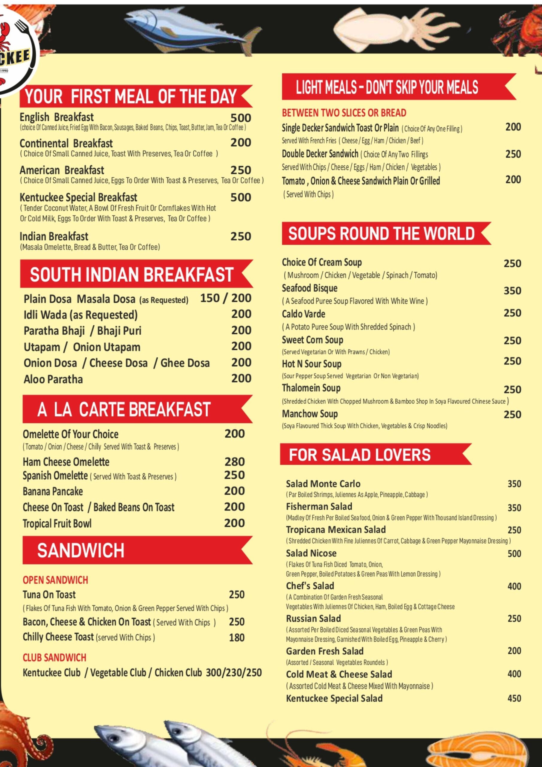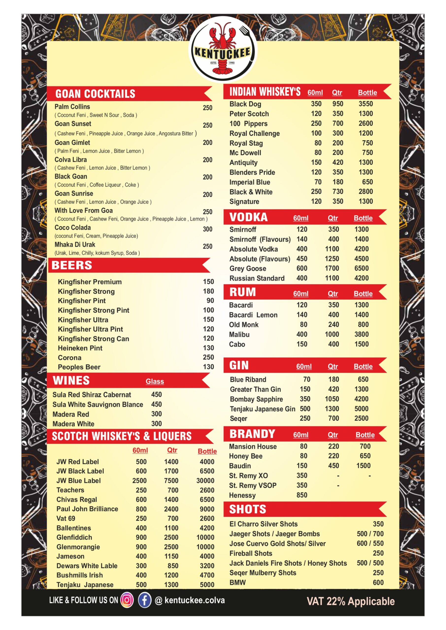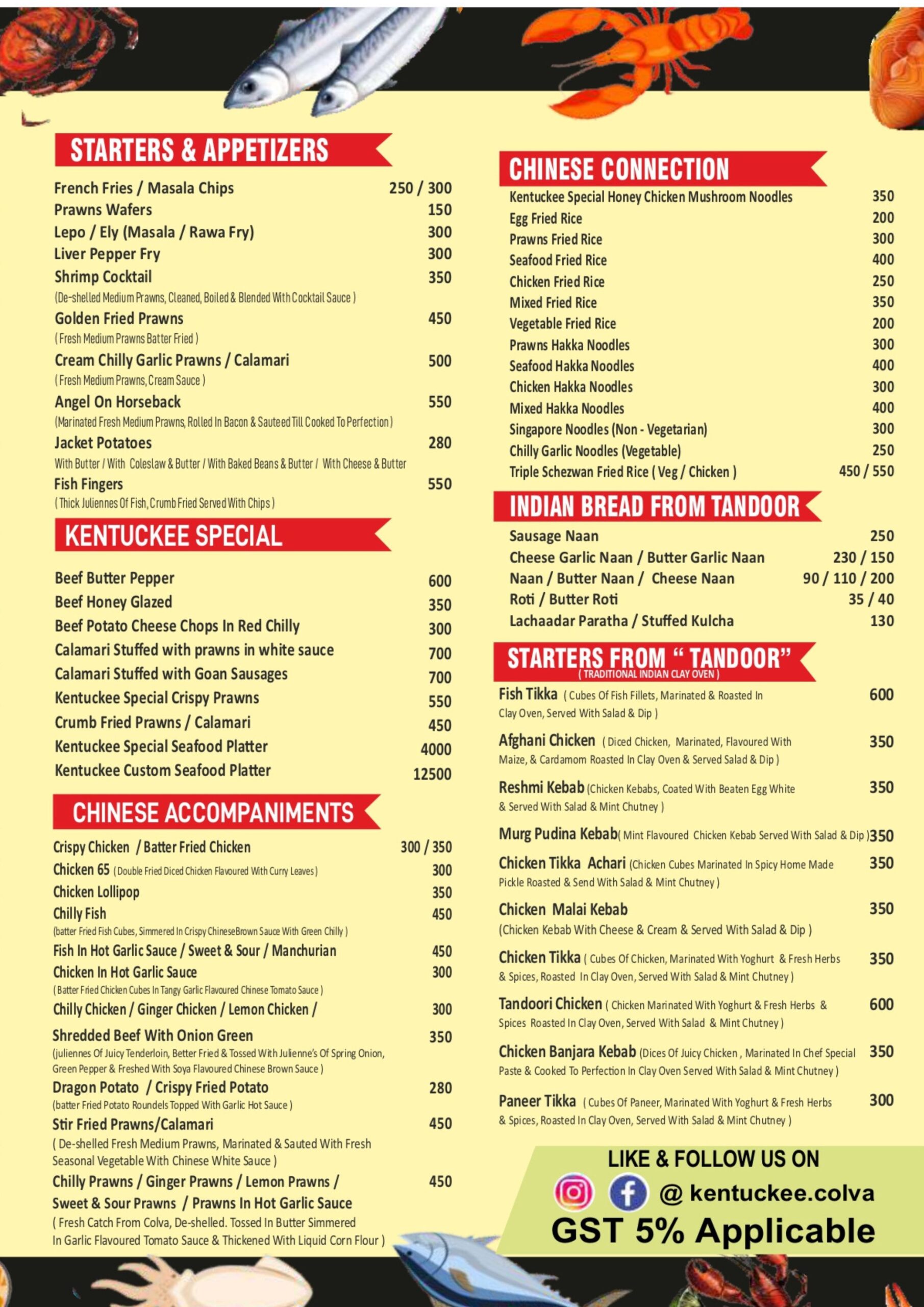 Our Menu dine-in | take-away | Delivery Restaurant Timing: 09.30 Am To 03.00 Am Browse Delivery Takeaway 0832 2788107 98221 21221 Connect Kentuckee Seafood Bar & Restaurant, Opposite Colva Circle, Colva Beach Rd, Colva, Goa 403708 0832 2788107 98221 21221 86988 67488